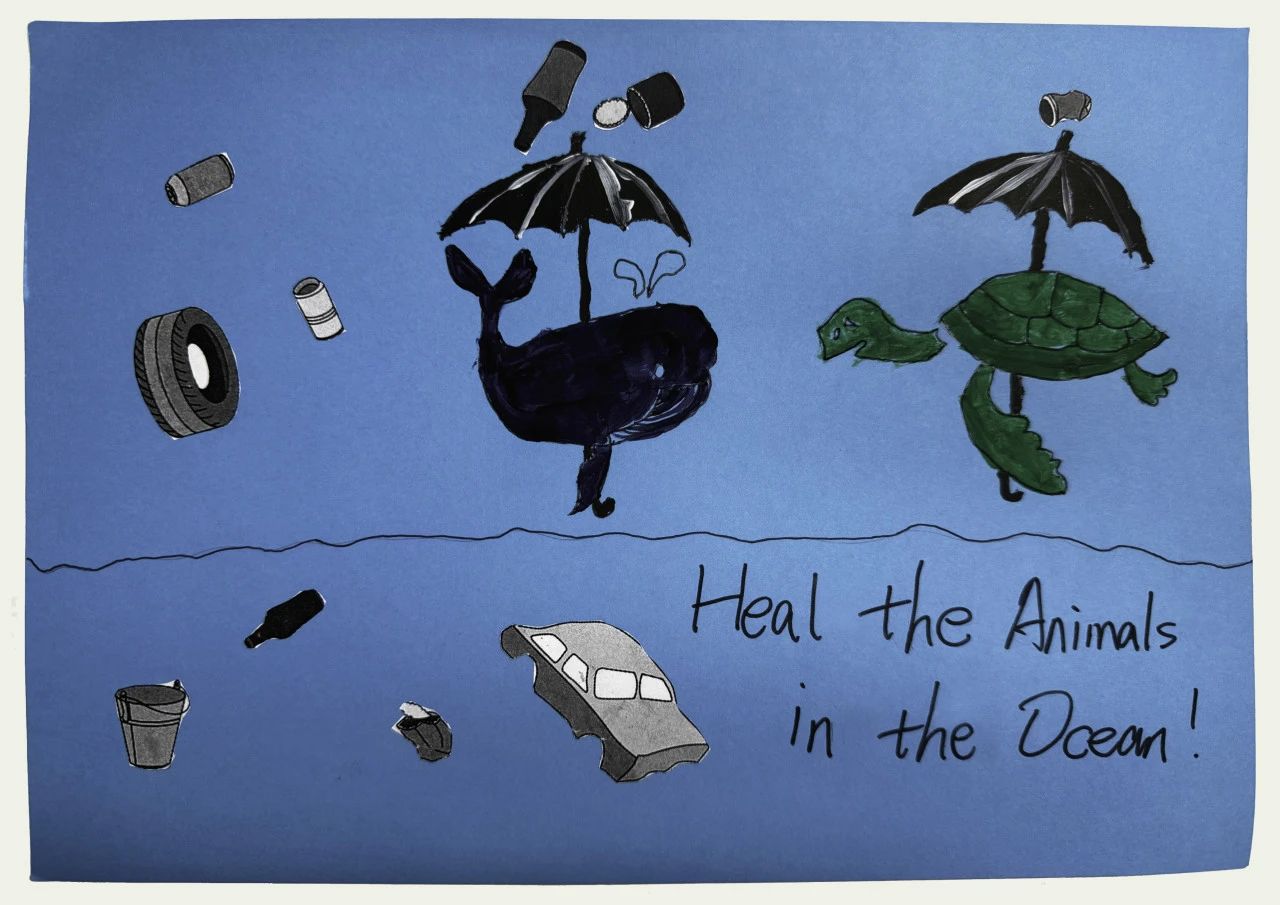 设计理念:该作品围绕保护海洋生物为主题展开,每个海洋中的生物都撑着一把雨伞来阻挡海洋垃圾,寓意海洋垃圾之多,污染之严重。同时,海洋中以及岸边随处可见的垃圾也体现出人类肆意破坏海洋环境的现状,呼吁人们要保护海洋生物,保护人类赖以生存的地球家园。