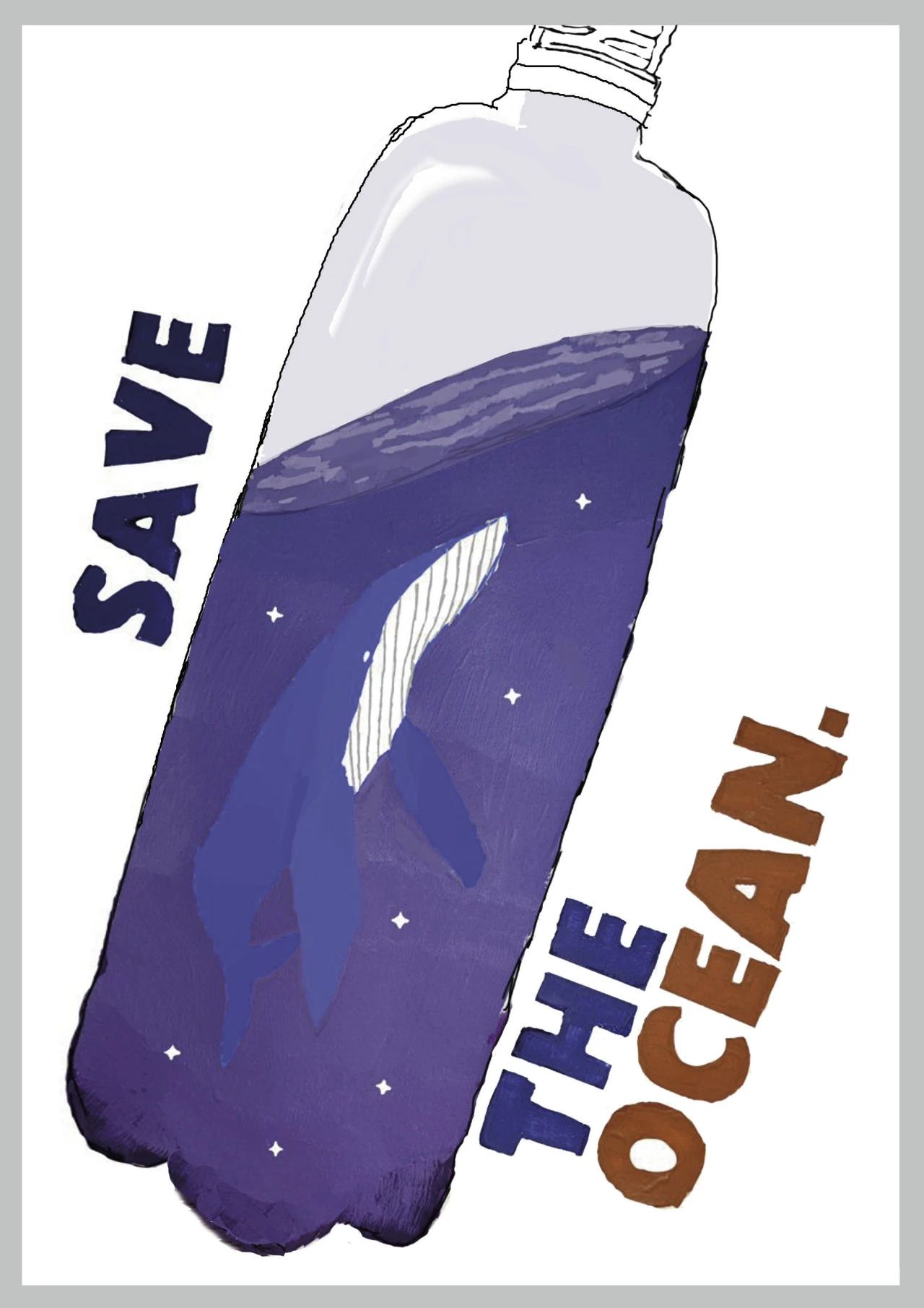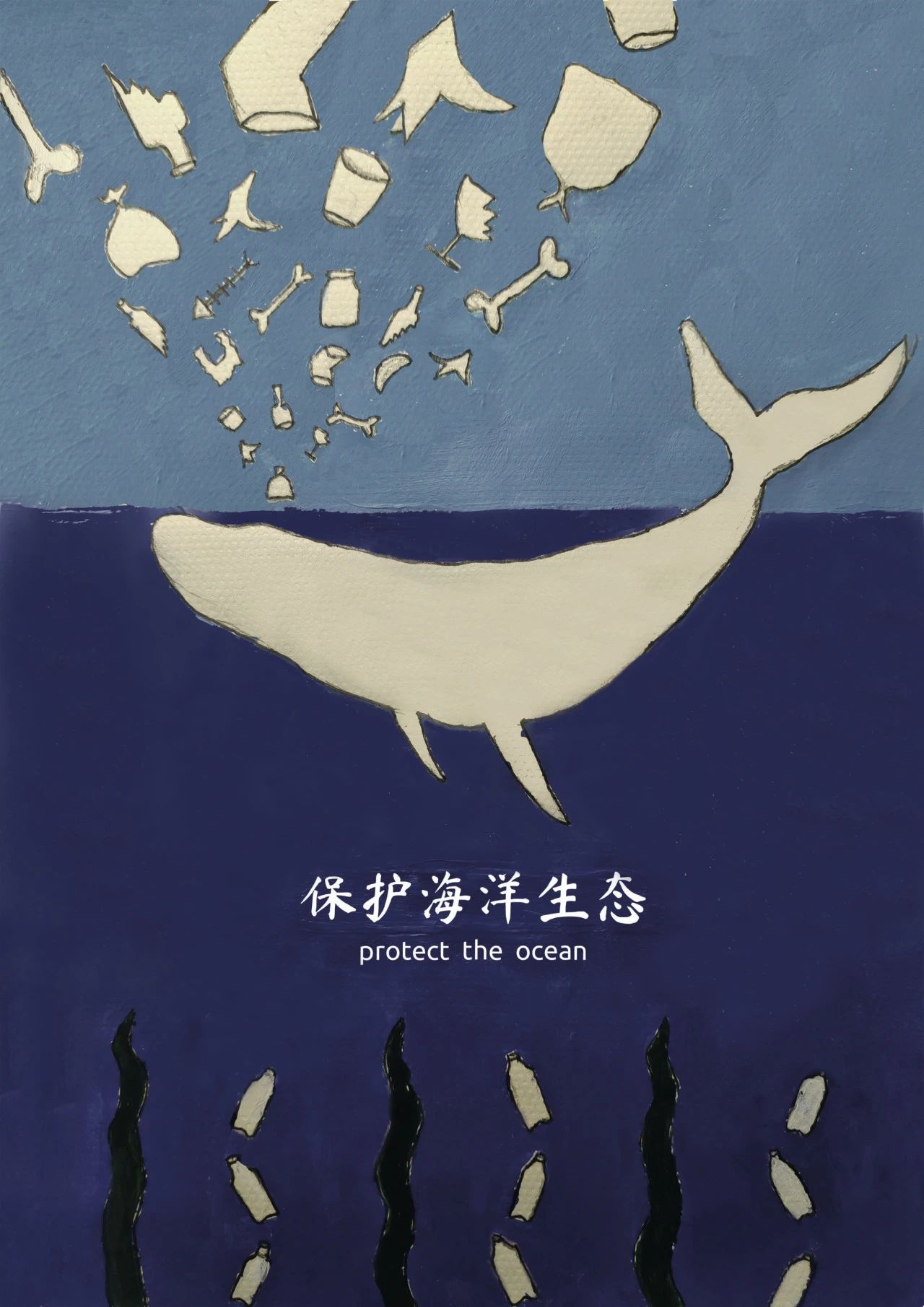 设计说明:鲸鱼本应遨游在星辰大海,却因污染被囚于塑料瓶中,这呼吁我们保护海洋,不要让鲸鱼只能存在于梦中。
