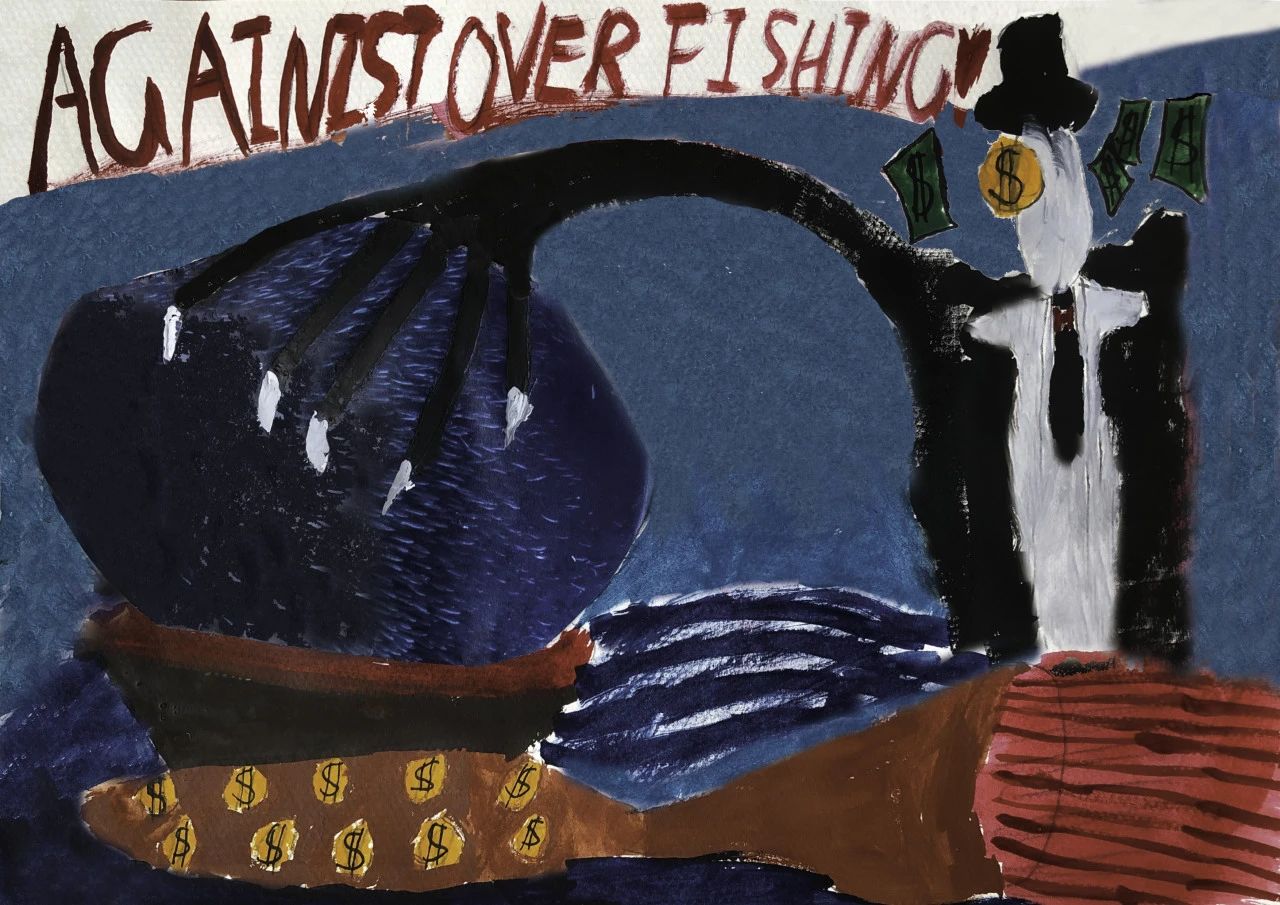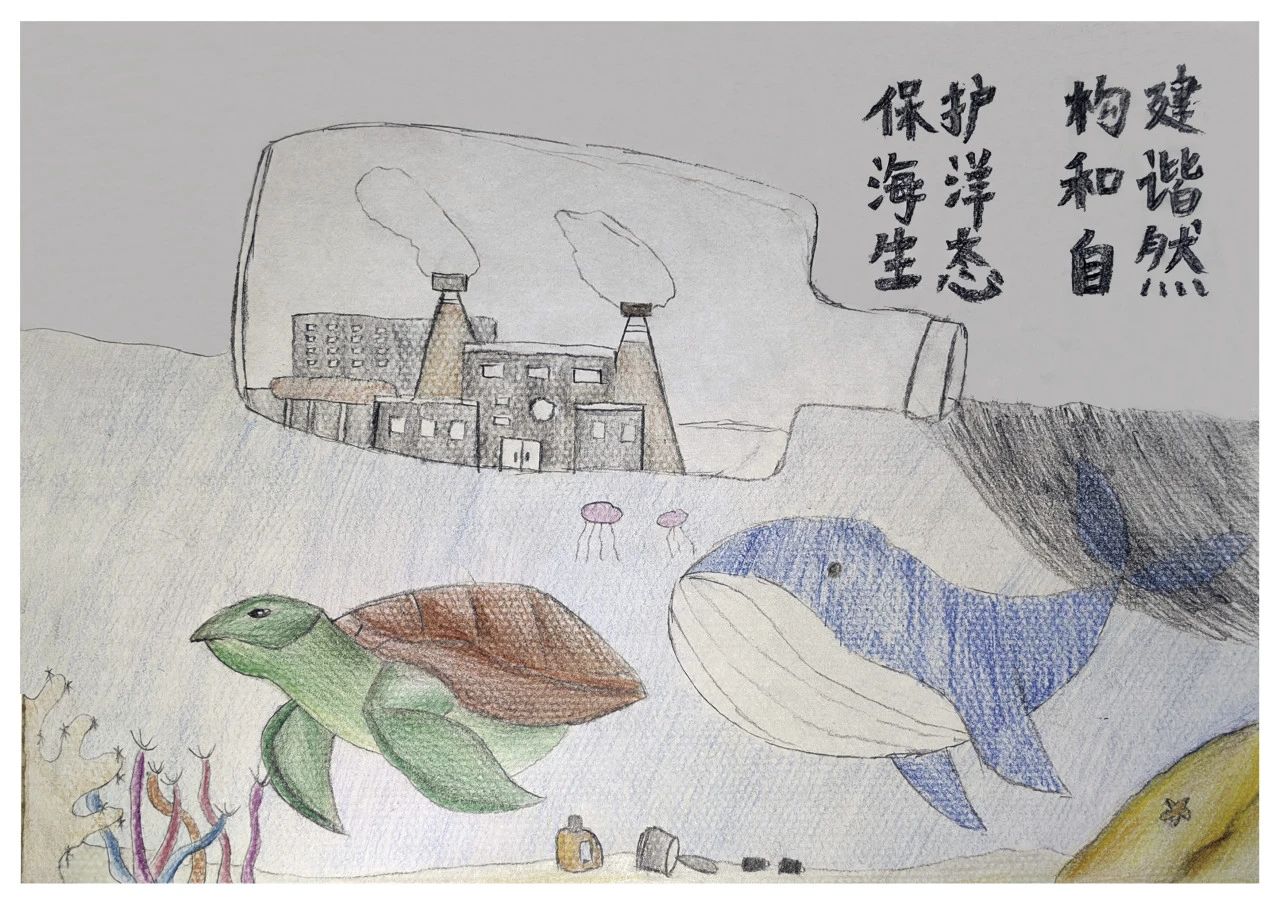 设计说明:作品体现了装载着各种工厂的巨型漂流瓶漂泊在海上,污水从中流淌出来,快速地污染着大海。图中鲸鱼的尾部已经被污染,展现出了工业对于海洋生态的不良影响。本作品旨在呼吁人们保护海洋生态,构建和谐自然。