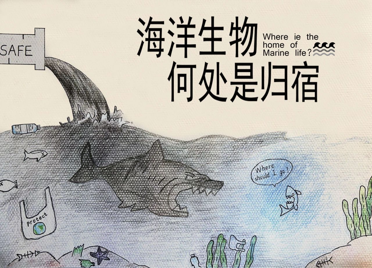 设计说明:标着“SAFE”字样的排水管排出来的却是黑色的污水,污水幻形成为巨大的鲨鱼向着鱼儿逼近,小鱼发出“Where should I go?”的疑问,海洋里随处可见塑料袋、水瓶之类的垃圾与死亡的小鱼,本该属于海洋生物的家园被严重破坏,可他们却无处可去,这提醒着我们要保护海洋,还海洋生物一个干净美好家园。