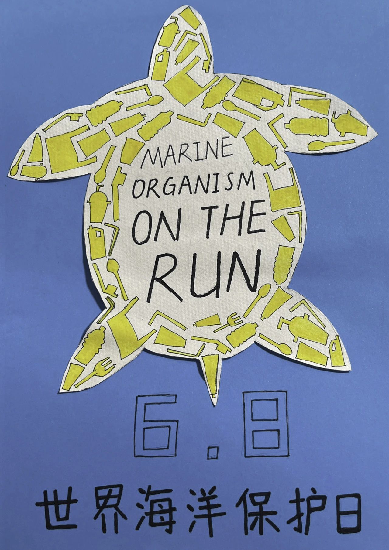 设计说明:本设计以海龟为形象,蓝色背景是海洋,图案中的黄色垃圾表示人类对海洋的污染,破坏了海洋生物的生存环境。中间的字体意为“海洋生物大逃亡”,因此我们呼吁保护海洋,并将6月8日设立为“世界海洋日”。作品旨在提倡人们保护海洋环境与海洋生物多样性。