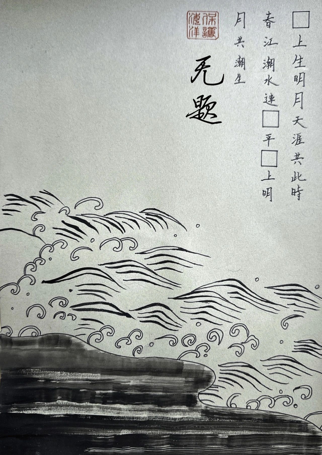 设计说明:作品名称《无题》。该作品围绕保护海洋展开,整体采用古籍/古画的表现元素,首先勾勒海洋的纹理,其下用水彩涂抹的逐渐干枯表现海洋的枯竭与污染;右上人们耳熟能详的诗句中“海”一字均用方块空格表示,借用碑文转拓至纯文本中表示字迹模糊不清时使用的符号,寓意海洋的逐渐消逝与散佚,以及人类文明对海洋的冲击;最后在印章中点出“保护海洋”四字的主题。