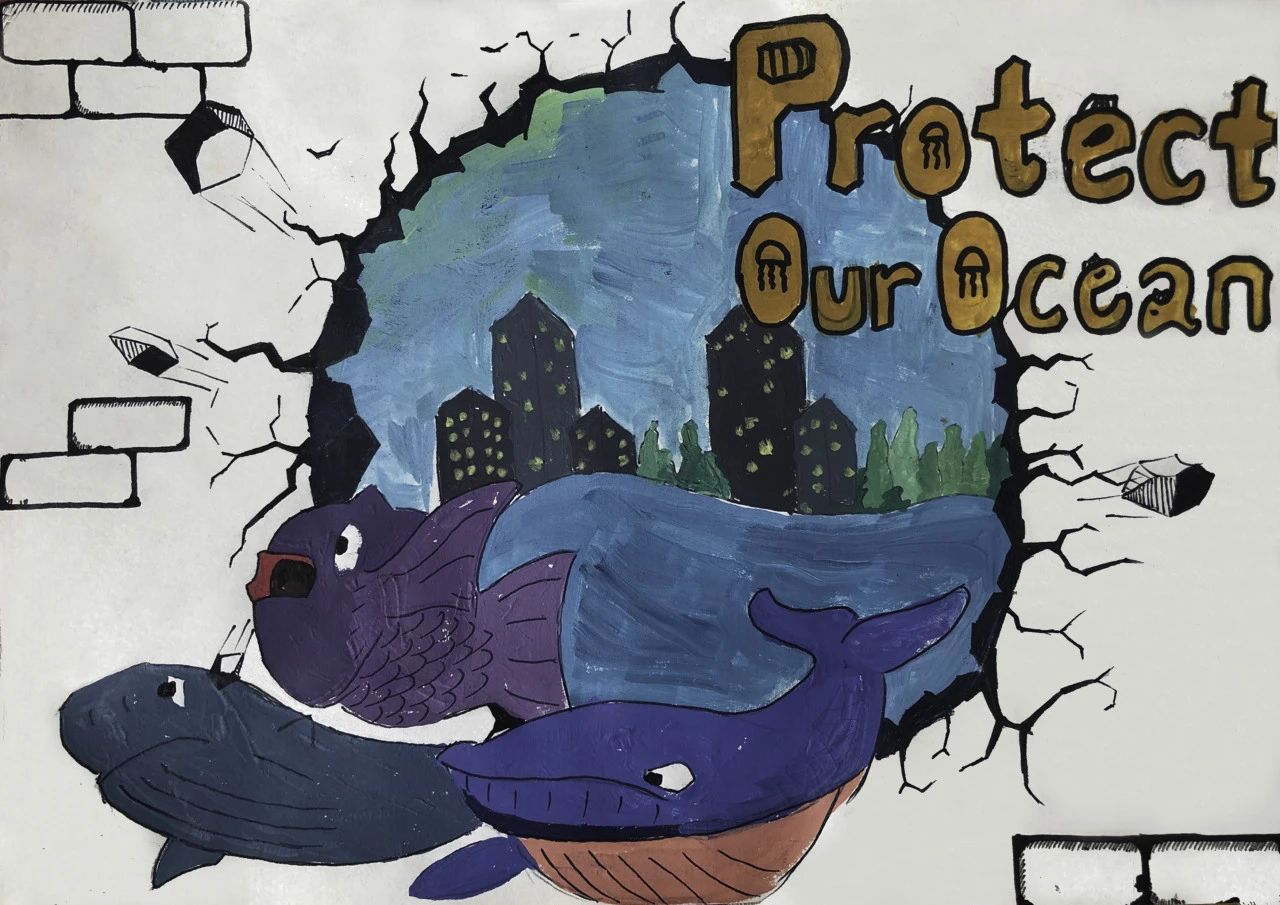 设计说明:本海报以"Protect Our Ocean"为主题,画面中间的城市与海洋的景象为设计核心.以明亮的色调展开,既富活力又具情感,而墙面破碎,三只鱼冲出墙面,仿若突破"次云壁"带给画面以动感,同时表明保护海洋刻不容缓。