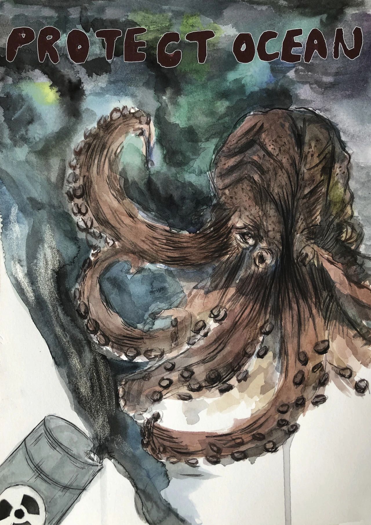 设计说明:作品是想表达污染、核废料与海洋生物的惨状。所以我选取了让人联想到畸形与压迫的章鱼作为画面主体,利用浓重的色彩体现污染和肮脏,仅在左下角露出半个核废料桶为整幅画面点题。这样我也可以把更多精力花在海洋生物的细节描绘和色彩调和上,更加突出该海报的视觉中心,作品中的英文作为文字要素,采用的拼贴方式。