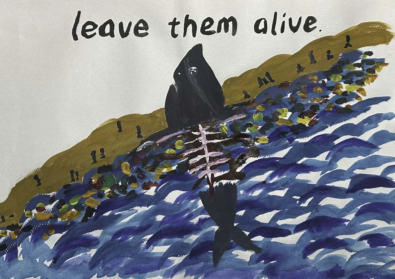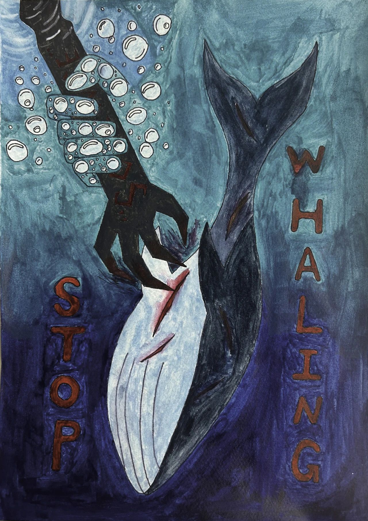 作品阐释:《Blood Red, Ocean Blue》,一鲸陨落沉海,伴携万物新生,这本应是海洋精灵们留给大海的最后温柔,可人类却为了利益,在这片海洋中进行着最为残暴野蛮的行径。鲸血流入大海,却无法染红那片蔚蓝,随着工业化与资本的需求,过度捕鲸已严重影响海洋生态,尽管人们对捕鲸已有条约限制,但仍有国家打着“科学”的旗号,为牟利大肆捕杀鲸鱼。