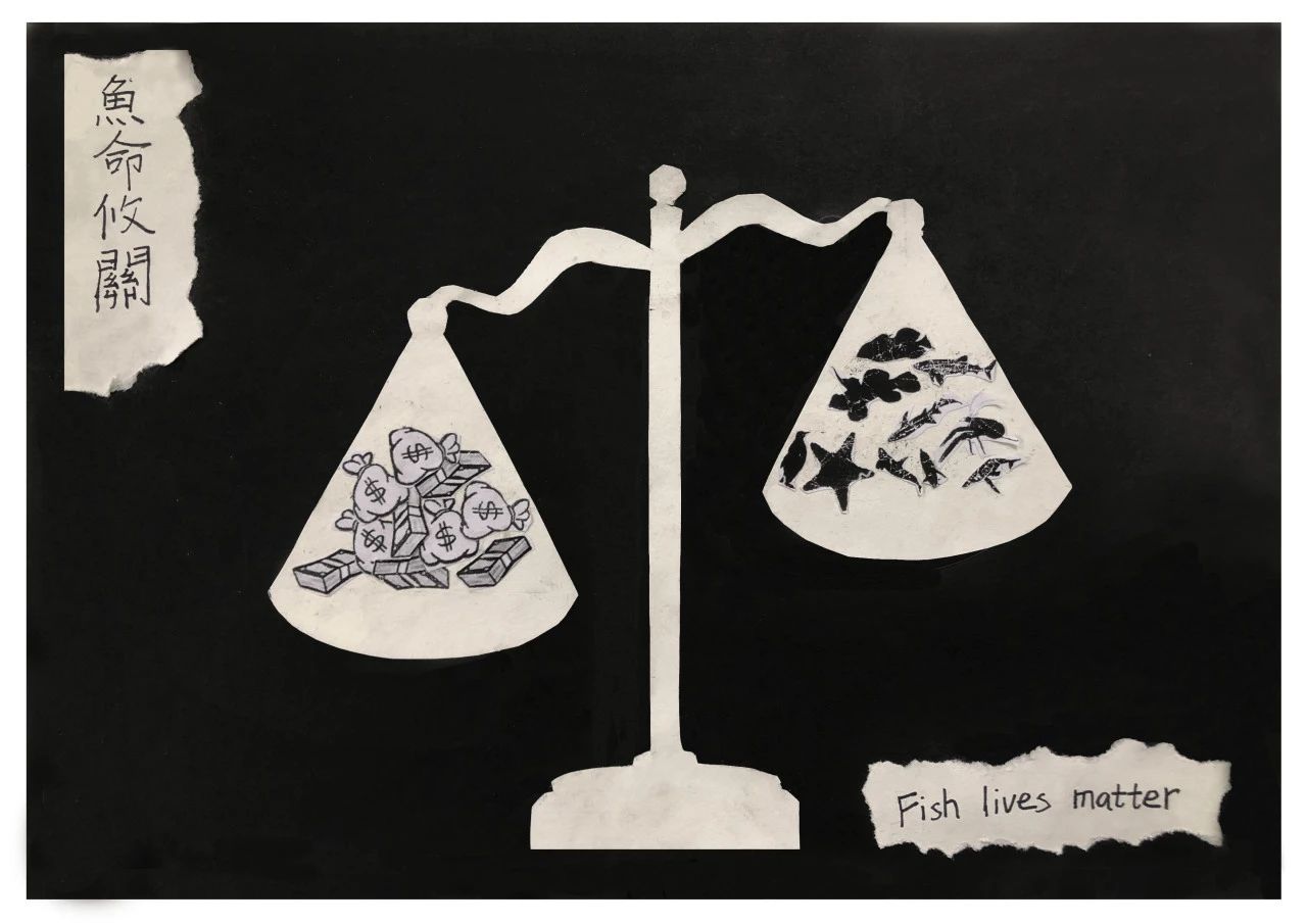 设计说明:这幅海报只运用了黑白两种颜色,世界上愈是黑白分明的东西愈是要出错的,画面的中间是象征“公平”的天平,天平上是金钱和海洋生物,天平向金钱方向倾斜了,寓意是人类为了经济而牺牲了海洋。