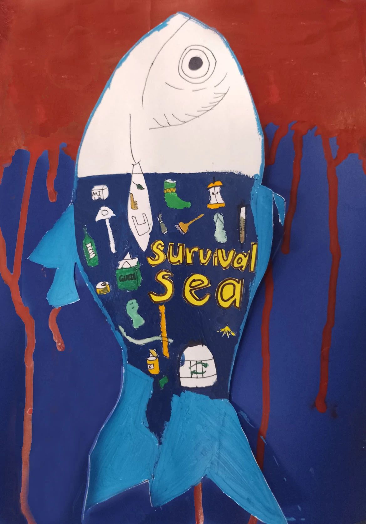 设计说明:该作品以海洋保护为主题,通过红色与蓝色的强烈对比,用流动的红色颜料象征血淋淋的海洋捕杀现实,用颜色较为暗沉深蓝色象征被污染的海洋环境。作品主体部分则是一条被垃圾填满的鱼儿,在一众生活垃圾之中,保护海洋的标语 "Survival Sea" 竟然在鱼儿的腹内,多么讽刺!