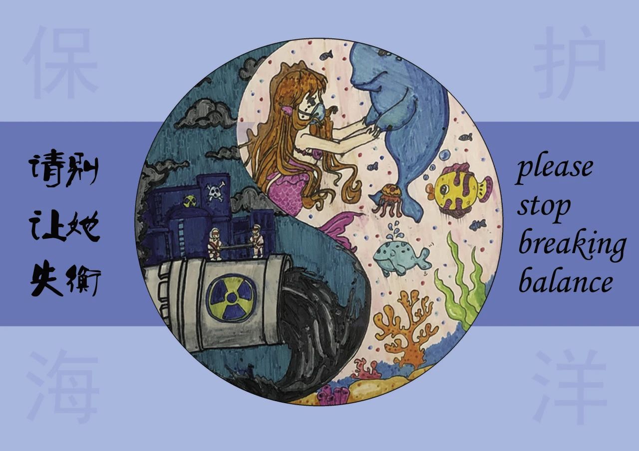 设计说明:画面以深邃的蓝色为基调,象征着海洋的广阔与神秘。然而,在这宁静的蓝色之中,却夹杂着刺眼的塑料垃圾、油污和死鱼的图像,这些细节生动地描绘了人类活动对是地球上最宝贵的自然资源之一,它孕育了无数生命,调节着全球气候。画面以太极为构图,意在体现海洋环境与人类发展的平衡。一边是人类在以排放核废水等方式污染海洋,一边是小美人鱼戴上口罩,忍受被污染的环境。画作提醒我们,保护海洋就是保护我们自己的未来。让我们一起响应这一呼唤,采取行动,为了我们共同的蓝色遗产,拒绝污染,守护蔚蓝。