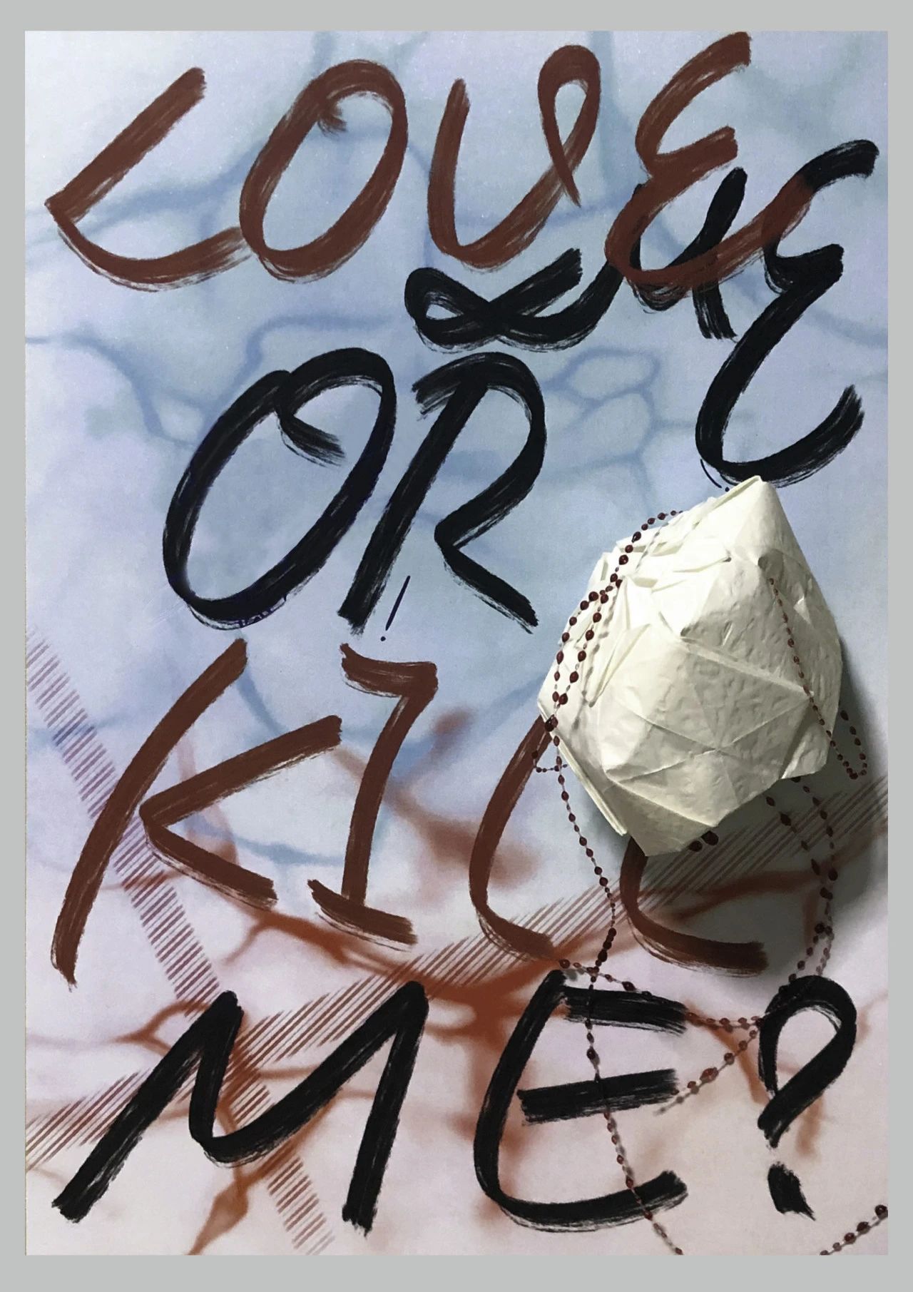 设计理念:以保护海洋生物为主题,整个画面使用海洋的水波纹为底部背景,上半部分的蓝色海洋与“love”相呼应,下半部分的海洋被血液污染透出红色,呼应“kill”。上方字母以烫蓝水母为点缀,画面中央以折纸水母为主体,红色钓鱼线与血滴缠绕水母,呼吁人们禁止污染。底部红色条纹化用黄色警戒线,突出警示意味。