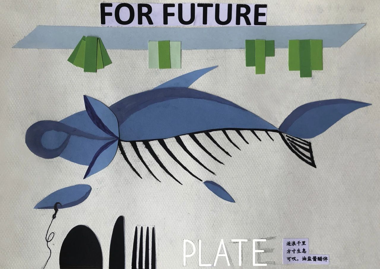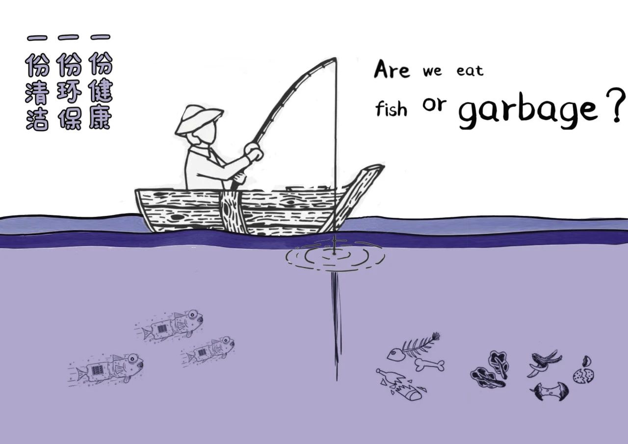 设计说明:海洋命运共同体,污染海洋最终会伤害人类本身。首先是海洋中大量存在的垃圾,在这样的污染环境中海洋生物也“变异”成“瓶子鱼”可见最终到我们餐桌上的海洋食物也已经被污染,人类正在自食恶果。