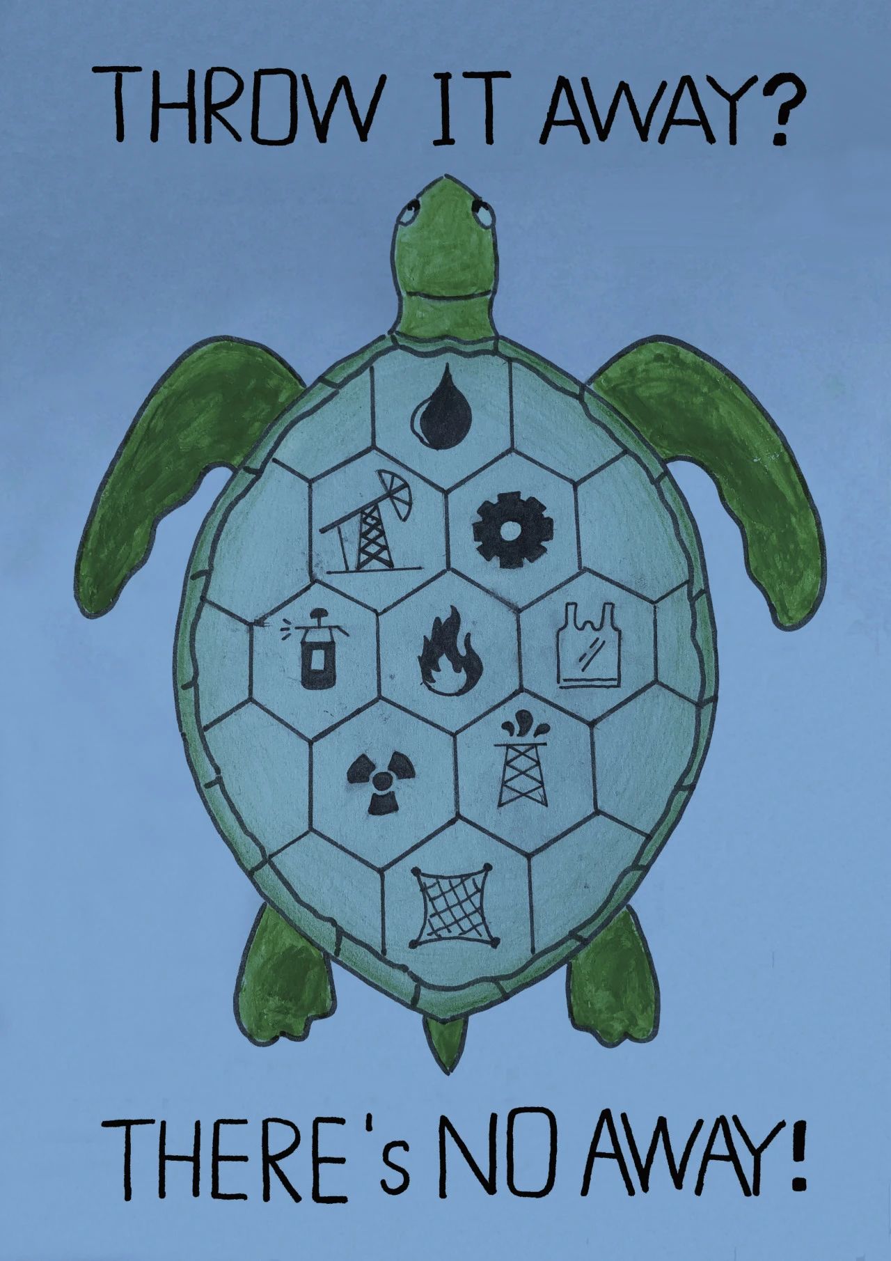 设计说明:基于保护海洋生物的主题,主要从塑料、易拉罐等垃圾对海洋生物的影响出发,辅以肆意排入大海的污水对海洋的影响,具体以被轮胎套住的鲨鱼、被水瓶套头的乌龟、如大鱼一般凶狠“吞食”海洋生物的塑料袋体现其危害,深化拒绝塑料污染的主题。