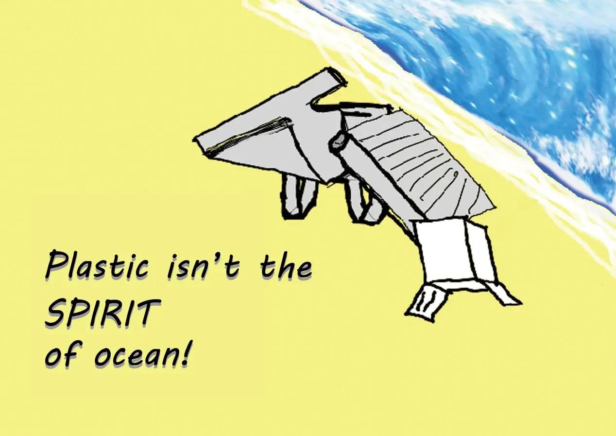 设计说明:本画以海洋沙滩为背景板,以塑料袋等白色垃圾为主体拼接成海豚的形状,海豚本应属于海洋,但却死在沙滩上,而塑料袋不应散落在沙滩上,就像文案所说:Plastic isn't the spirit of ocean!塑料并不是海洋的精灵海豚,我们要保护环境,避免白色污染,别让我们只剩下塑料垃圾拼成的的假海豚以供追忆。
