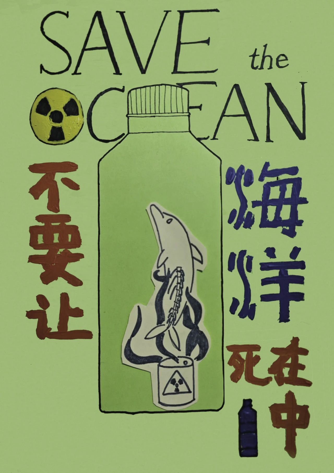 设计说明:现如今海洋塑料污染与核废料排放日益加剧。海报中的瓶子象征着塑料瓶对海洋生物的桎梏,有着泪滴形眼睛的海豚有一半身躯已然变成骨架,是为了展现许多海洋生物已经危在旦夕。从核废料桶中伸出的黑色触手牢牢缠住海豚,更是突显核废料排放对海洋生物的残害。鲜明的字体是为了警醒人们关爱海洋生。