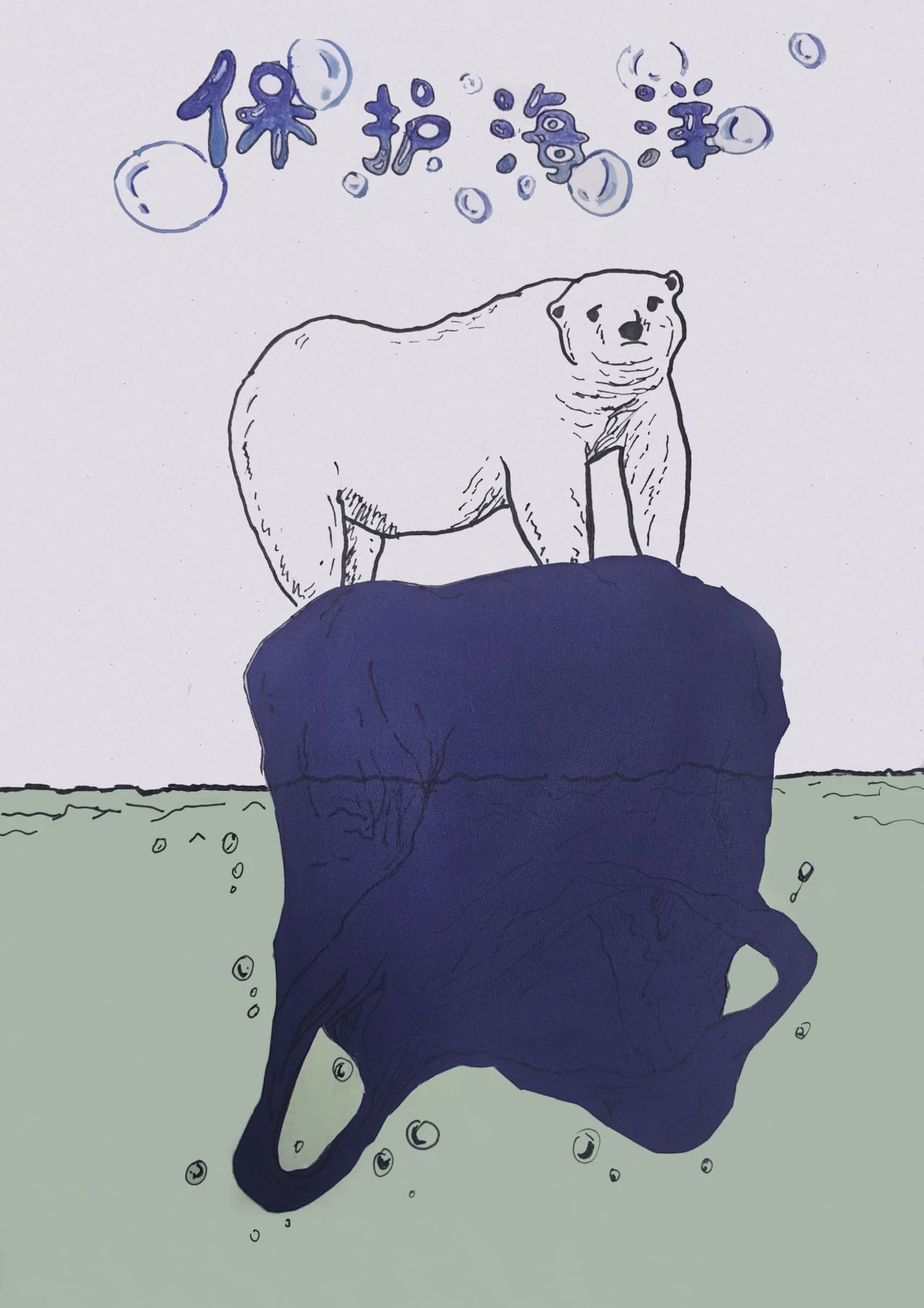 设计说明:本设计主题为以北极熊和塑料袋为主体的海洋保护海报。蓝色塑料袋露在海洋上的一部分为融化得只剩一小部分的冰山,而实际上整体为塑料袋。体现人类对海洋的破坏导致的全球气候变暖、冰山融化严重威胁到了海洋生物,海洋被破坏严重。文案保护海洋与“protect the ocean now”欲呼吁人们对海洋与海洋生物的重视与保护。