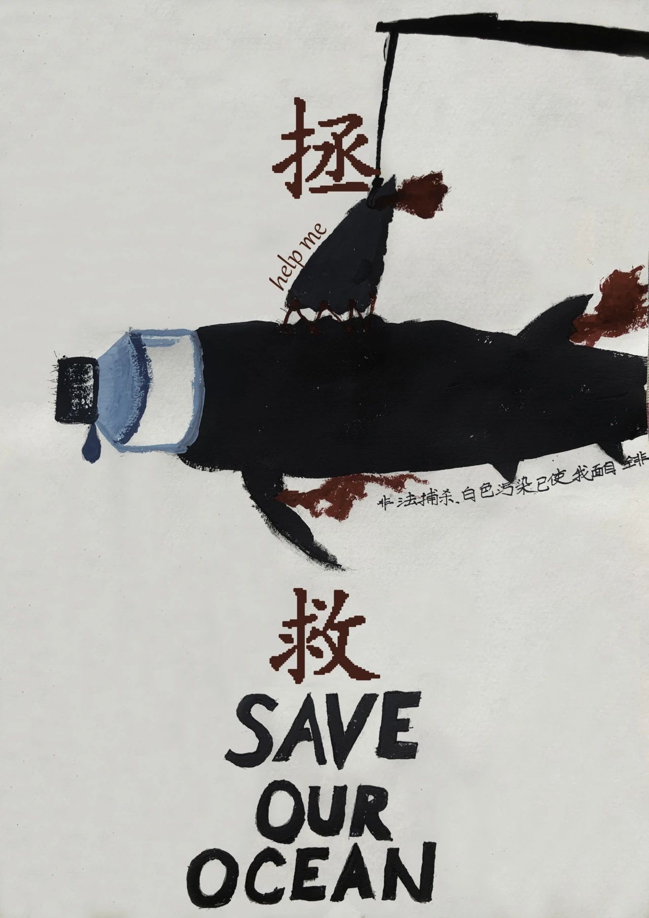 设计说明:作品主体是一只受伤的鲨鱼,其上鱼鳍被一根鱼竿吊起与身体分裂,只凭细线所连,意寓着非法捕鱼;其头部变成一矿泉水瓶,意寓着白色污染对海洋生物影响严重;鱼体周围的“help me”“非法捕捞,白色污染已使我面目全非”点明海洋所面临的危机;主体文字“拯救”“SAVE OUR OCEAN”呼吁人们一起拯救、保护海洋。