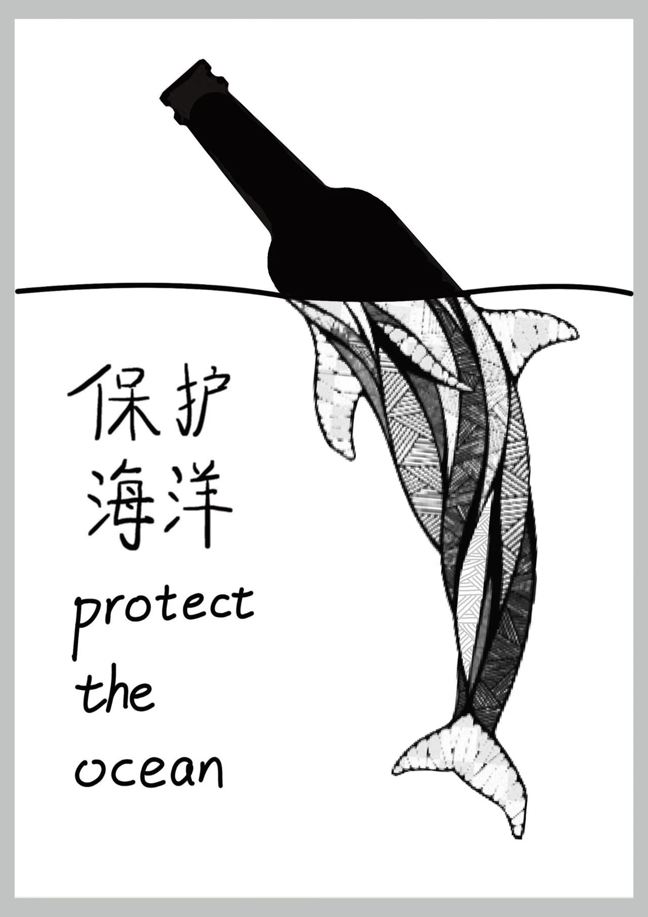 设计说明:该作品围绕保护海洋的主题展开。画面主体为浮出海面的一只海豚,而海豚浮出水面的部分由玻璃瓶剪影构成,以高度简洁的画面直观展现海洋垃圾对海洋生物的威胁,呼吁人们保护海洋环境,避免让海洋垃圾取代美好的海洋生物。
