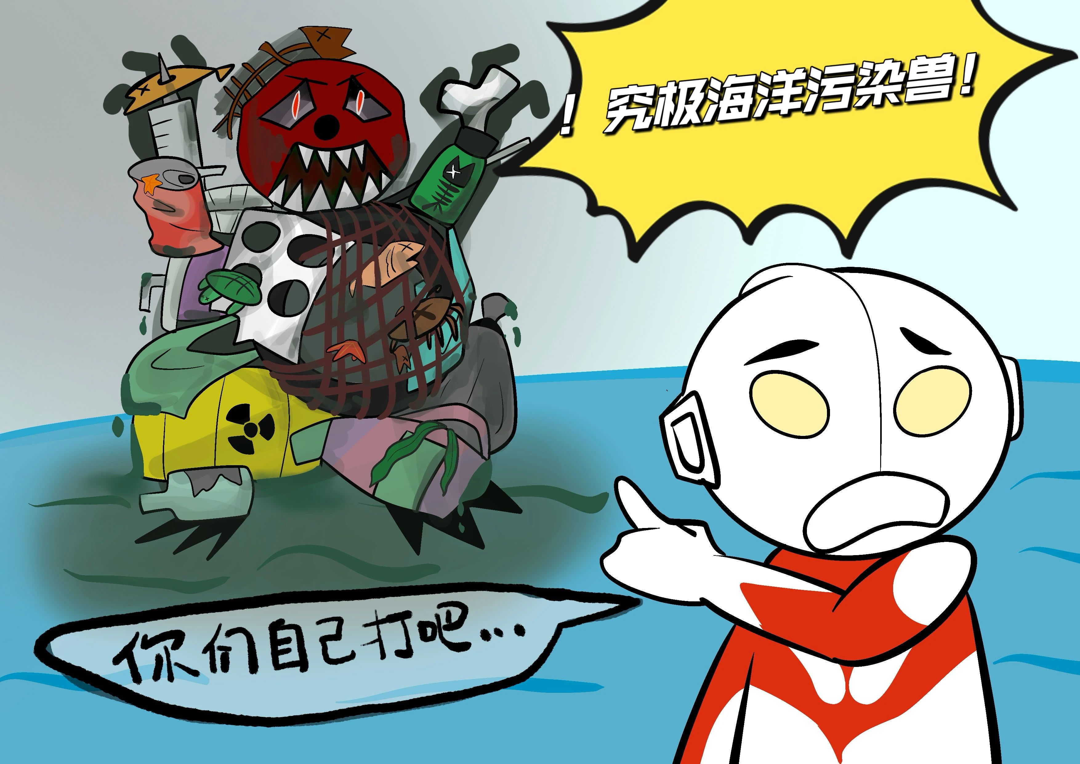 设计说明:该作品以保护海洋为主题,将核污染、海洋垃圾等海洋污染情况具象化为怪兽,表现海洋污染的危害,还在画面中添加了“无奈的奥特曼”,丰富内容的同时呼吁人们抛弃幻想,积极行动起来保护海洋。