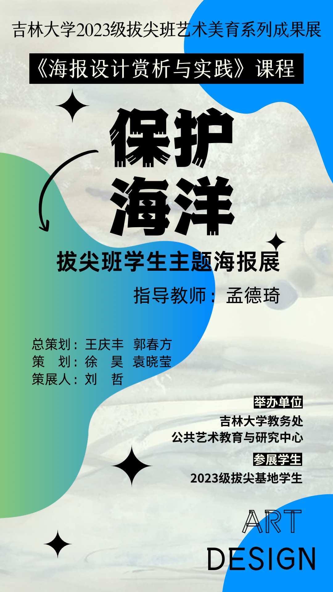 本学期,教务处为2023级拔尖基地(包括唐敖庆理科试验班:化学基地、数学基地、物理学基地、生物科学基地、计算机科学基地;匡亚明班:哲学基地、考古学基地、中国语言文学基地、理论经济学基地)及匡亚明文史试验班、黄大年班、李四光班、吕振羽班、生物育种班等开设了艺术必修课程,在音乐课程的基础上,增设了设计课、绘画课等教学板块,这些课程旨在培养员工们的审美意识和艺术素养。其中《视觉传达设计赏析与实践》课程板块的选课同学们积极探索学习视觉传达设计的理论与实践,本学期以其中一个教学模块“海报设计”作为结课作品展主题,围绕保护海洋这一议题展开创作。
