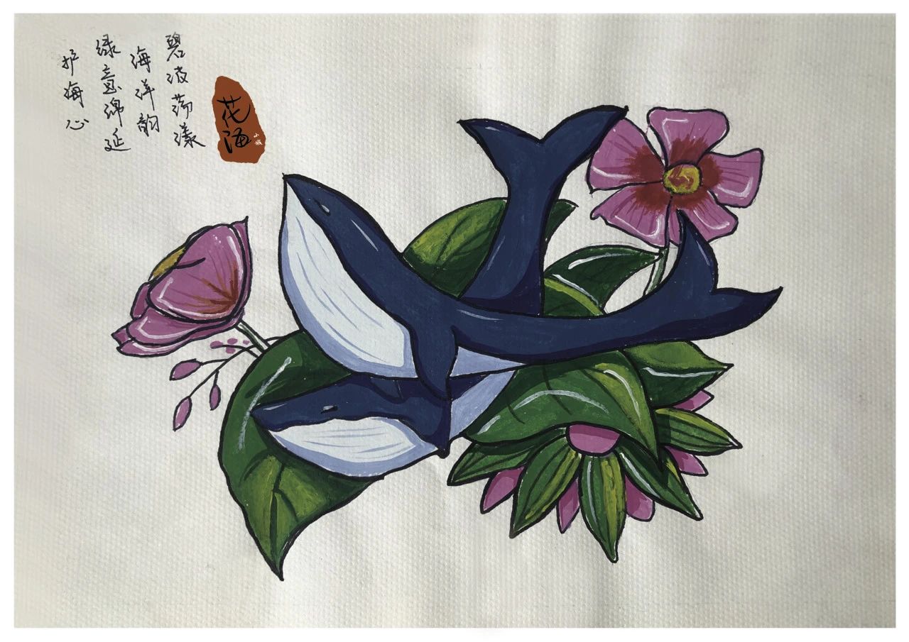 设计说明:本作品以“碧凌荡漾,海洋,意绵延,护心”为灵感,绘制了一只蓝色鲸鱼与粉色花朵的和谐共生。蓝色鲸鱼象征深邃的海洋,粉色花朵则代表心中之美好。画面采用水彩画技法,色彩对比鲜明,绿色叶子环绕,寓意着生命的繁盛与自然的和谐。整体设计旨在表达对大自然的热爱与敬畏,以及对生命的赞美与珍视。同时,通过简洁而富有象征意义的元素,传达出作品的情感深度与视觉吸引力。