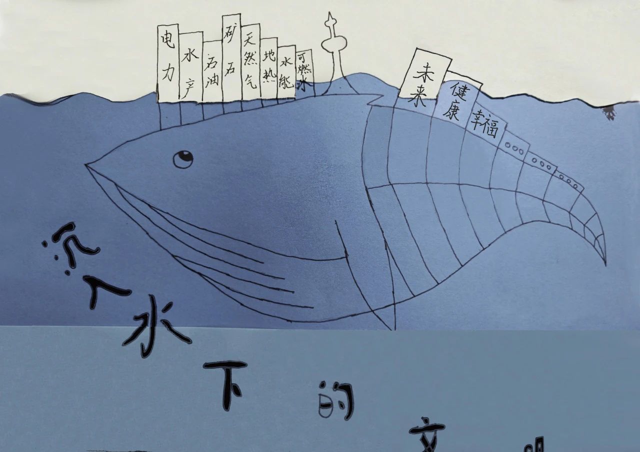 设计说明:利用鲸鱼来表现海洋,其上有楼房,以表现海洋承载人类文明,而楼房和文字倾斜表现即将沉没,后半骨架表现海洋受到侵蚀。以此说明受到污染的海洋无力承担人类文明,以表现海洋生物对人类的重要性。
