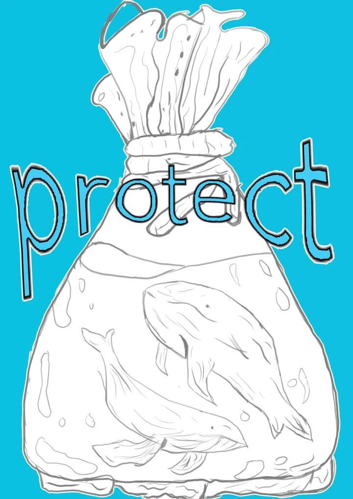 设计说明:作品通过鲸鱼困在塑料袋里的表现方式,旨在说明因为人类对海洋进行白色污染等各种破坏,导致海洋生物生存环境越来越少,失去了本来的家园,最后只能被人类圈养,以这种畸形的方式进行保护,蓝色背景表明原来的海洋环境已经与海洋生物目前的生存环境格格不入,灰白的线条表现海洋生物黑暗的未来,“protect”的单词呼吁人们对海洋进行保护。