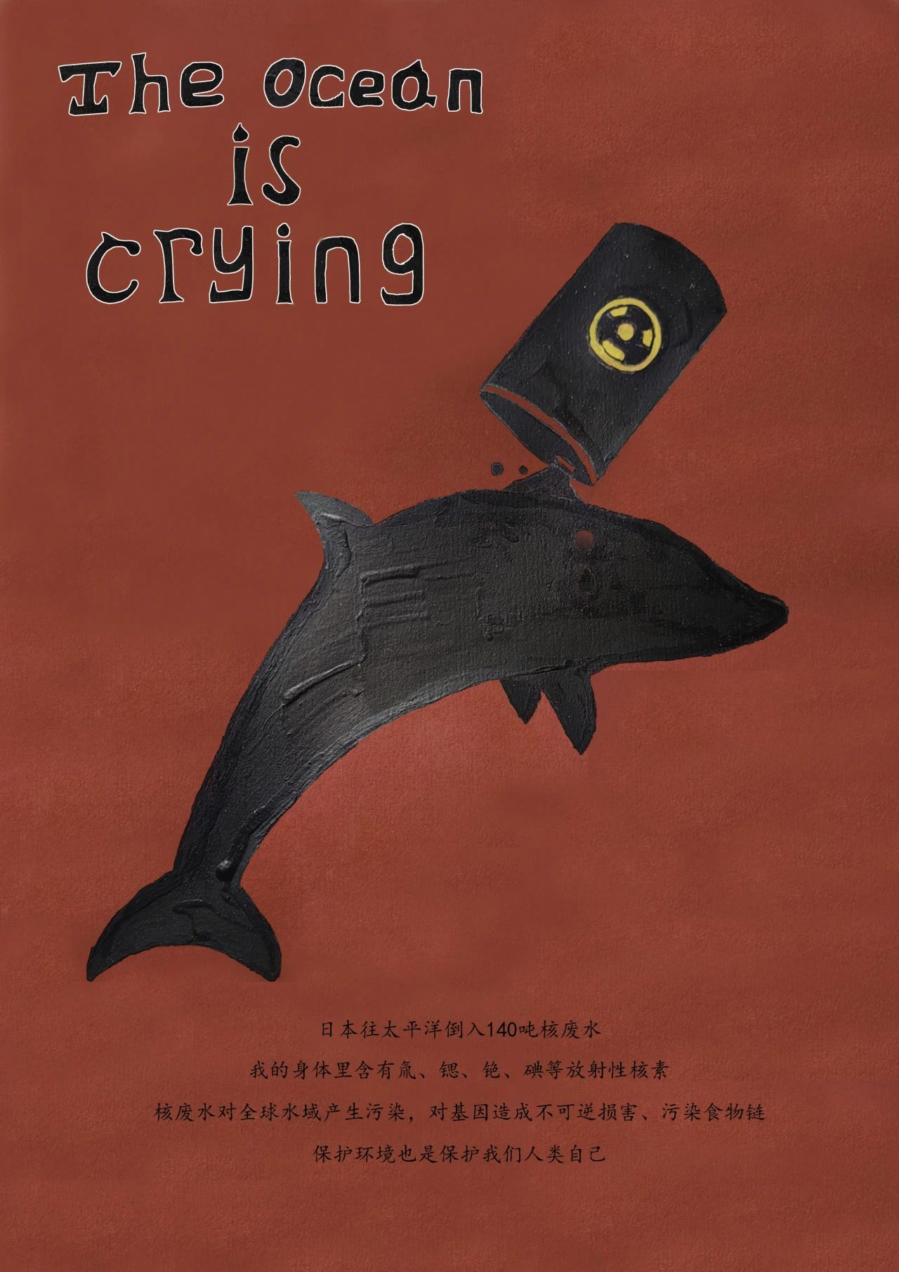 设计说明:本作品的主题是“海洋在哭泣”,以黑色和红色为主色调,海报的主题是一只海豚,核污水倒在它的后背上,海豚的眼角有一滴泪水,象征着核污水排海使海洋生物失去了家园。人类对海洋的破坏,无数海洋生物流离失所甚至殒命,我们仿佛能听到那无数海洋生灵的苦苦哀求,苍茫大海的哭泣。