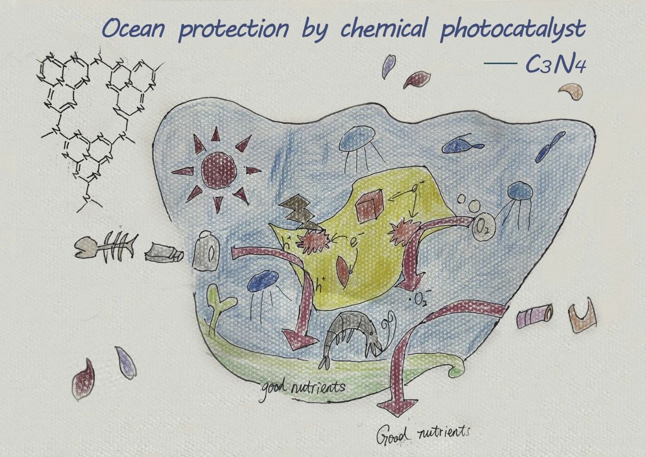 设计理念:我的设计融合了化学学科的元素,既然是环境保护,那么图中蓝色的部分便是海洋,海洋中的一些污染物品自然是有害的,利用一种光化学催化剂可以“变废为宝”把那些不好的垃圾通过化学分解形成好的营养离子供海底的水草等植物吸收,从而沿着食物链逐级上升,进而影响到人类的生活。