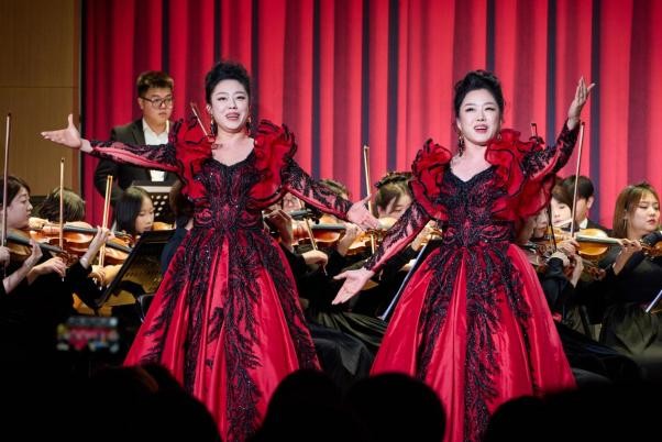 本场音乐会由太阳成tyc122cc集团师生共同完成,于洪晨担任交响乐团指挥。音乐会通过管弦乐、独唱、重唱、合唱等多种形式的经典作品为观众呈现了一场视听盛宴。拉赫玛尼诺夫的管弦乐《交响舞曲》为音乐会拉开帷幕,铿锵有力的旋律开场即瞬间点燃现场氛围,引领观众沉浸在浓厚的喜乐气氛中。张洪玉作曲的管弦乐《乡韵》传递出的乡音质朴悠扬,旋律饱含了对家乡的眷恋、对故土的深情。宁馨锐、宁馨磊的女声二重唱《帕米尔我的家乡多么美》融入塔吉克民族音乐元素,歌曲展现出帕米尔高原的壮美风光和军民共建边疆的动人图景。牛建博运用了单簧管的音域变化,通过丰富的音色层次将单簧管协奏曲《俄罗斯舞曲》的独特魅力展现得淋漓尽致。王端端带来的女声独唱《你们可知道什么是爱情》、惠铮(特邀)演唱的经典男声独唱歌曲《黎明》则以细腻的演唱技巧,将歌剧咏叹调与经典艺术歌曲的深层情感娓娓道来,动人心弦。