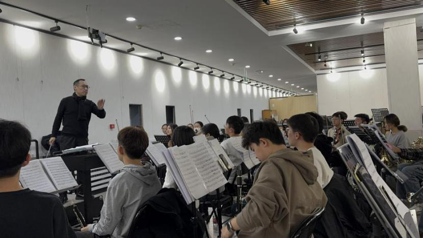 袁丁老师通过循循善诱的指导激发同学们的演奏热情。在他的带领下,乐团同学们将每一个音符都演绎得饱含深情、动人心弦。 袁丁老师还特别注重乐团成员之间的协作与配合,他耐心地指导每一个声部的演奏,细致入微地调整音乐的节奏和力度,力求使整个乐团在演奏过程中达到最佳的和谐状态。在他的悉心指导下,同学们逐渐克服了演奏中的种种困难,彼此之间的默契和协作能力得到了显著提升。