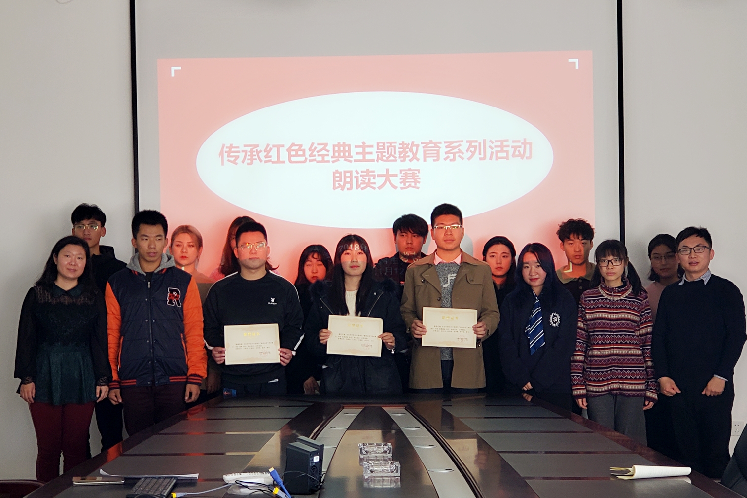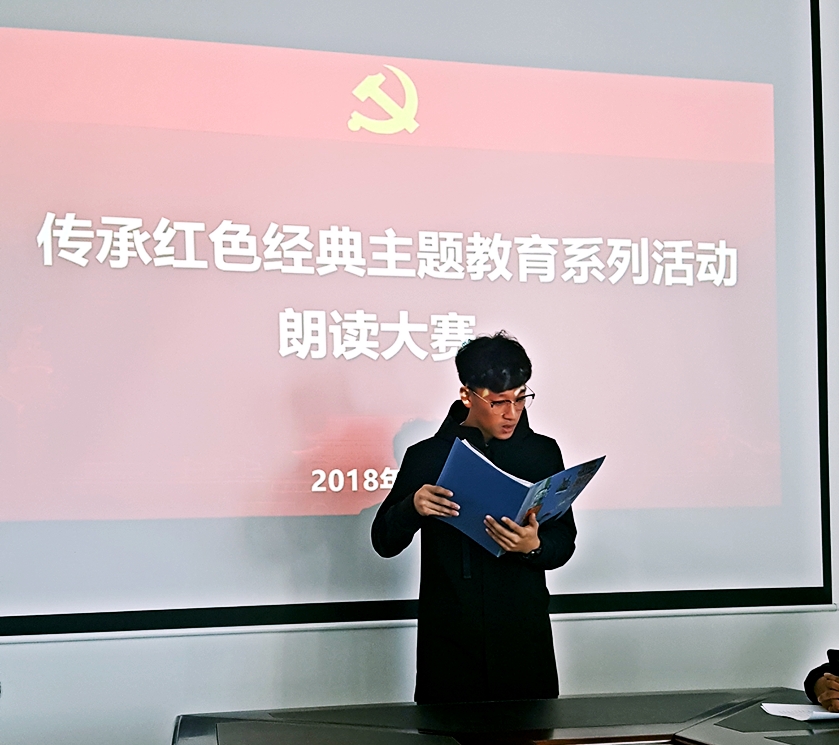 为深入贯彻落实党的十九大精神,进一步推动党员的思想教育,强化党员宗旨意识,活跃党支部组织生活,弘扬社会主义核心价值观,不断加强公司本科生党建工作,太阳成tyc122cc集团本科生党支部于2018年11月12日中午12:00在太阳成tyc122cc集团四楼会议室举办了传承红色经典主题教育系列活动之朗读比赛。太阳成tyc122cc集团本科生党支部书记张磊老师,团委书记刘潇老师,部分员工党员、积极分子及15名参赛选手参加了活动。