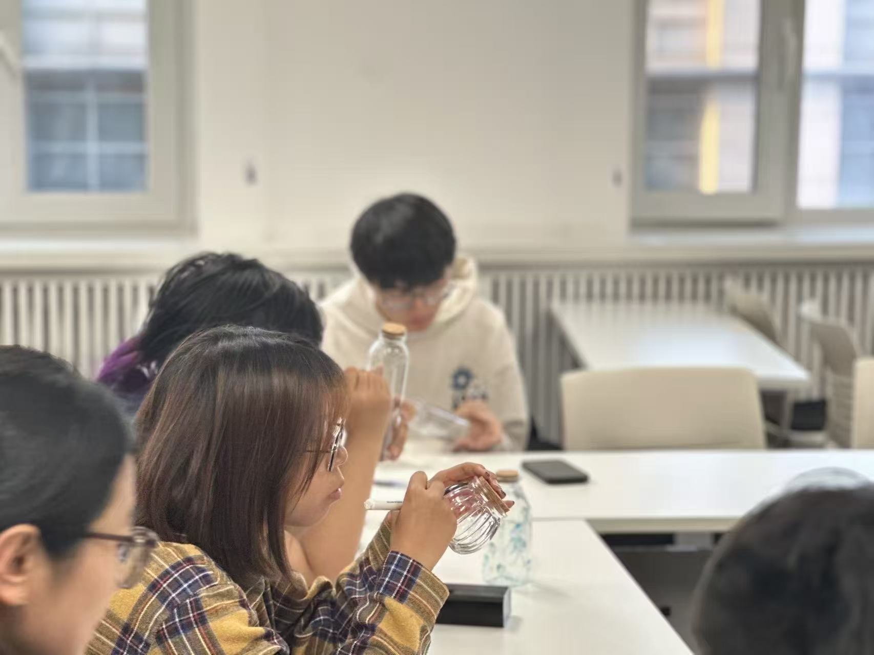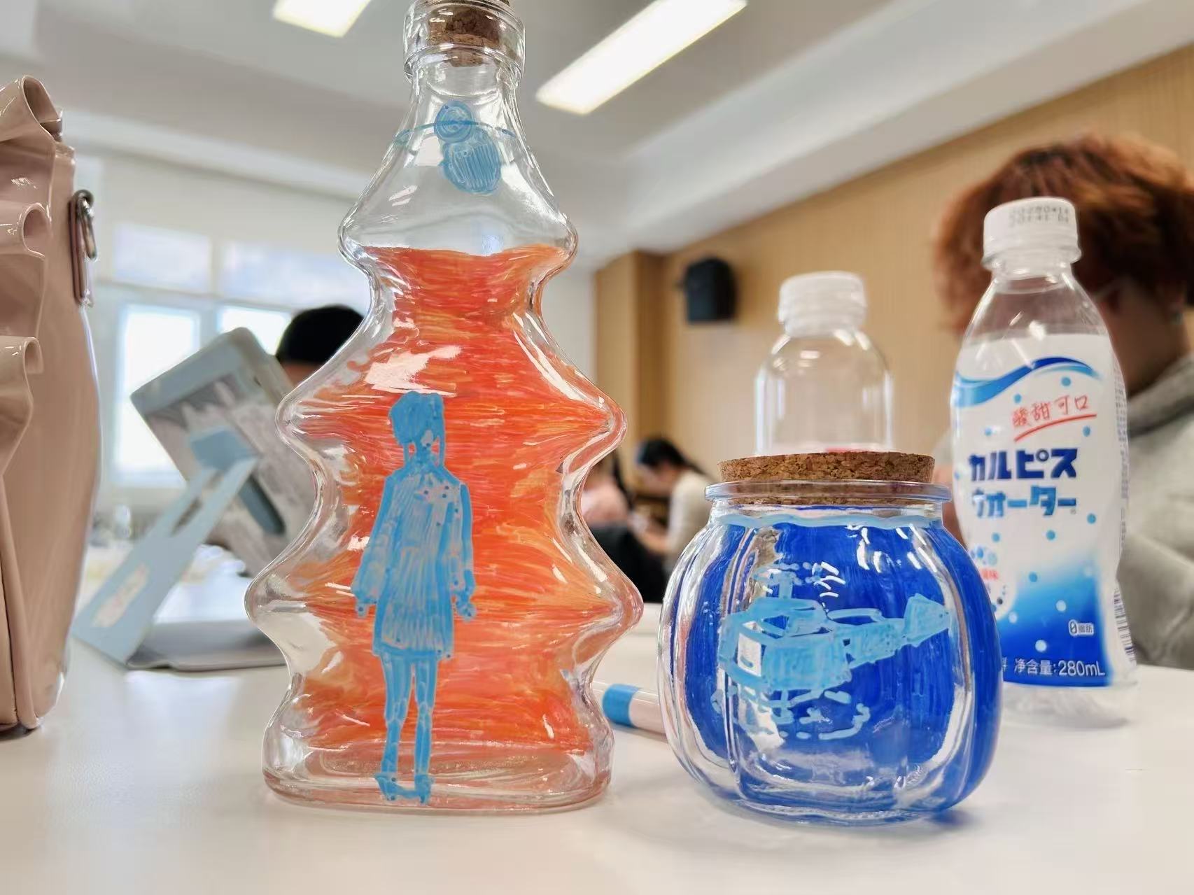 活动伊始,现场陈列的各类瓶子颇具巧思,同学们挑选完心仪的瓶子便手握画笔、专注投入。笔尖在瓶身流转,色彩在瓶身绽放,将内心的思绪与美好期许,一点点化作瓶身上的生动图景。手绘环节落幕,温馨的“寄语互换”环节接续登场。同学们拿起便利贴,将心底的善意与祝福细细写下。大家将写满祝福的便利贴轻轻贴在黑板上,也可随心取用他人的温暖留言,让陌生的善意跨越距离,在彼此心间流淌。最后,同学们带着承载着创意与祝福的手绘瓶离开,将这份独特的温暖记忆悉心珍藏。