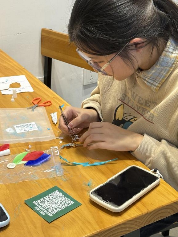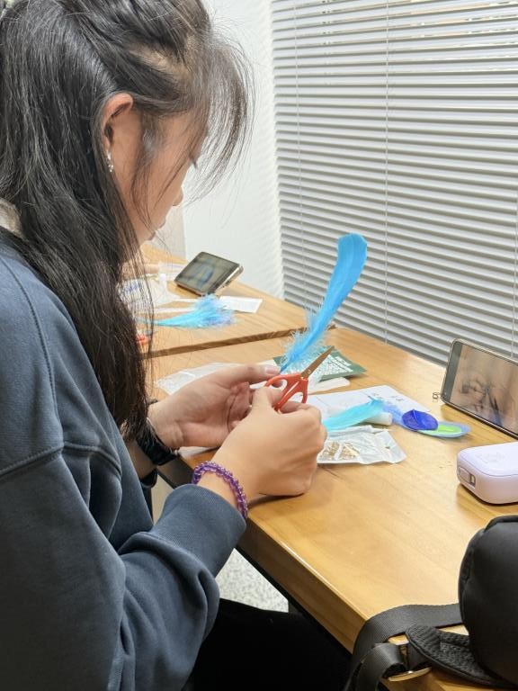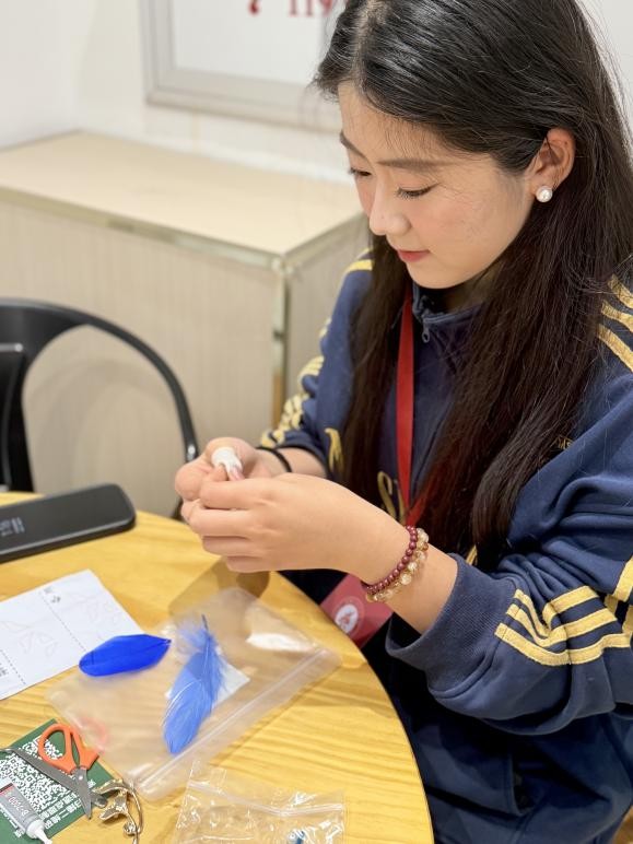 活动伊始,志愿者同学以图文结合的形式,追溯点翠工艺的千年历史,从古代宫廷饰品的璀璨风华,到鹅毛仿点翠的传承创新,解读工艺背后的文化内涵与匠人精神。在技艺示范阶段,手工志愿者指导同学聚焦剪毛塑形、分层粘贴、配色点缀等核心步骤,放慢操作节奏、拆解关键技巧,耐心解答同学们的疑问,让大家快速掌握制作要领。